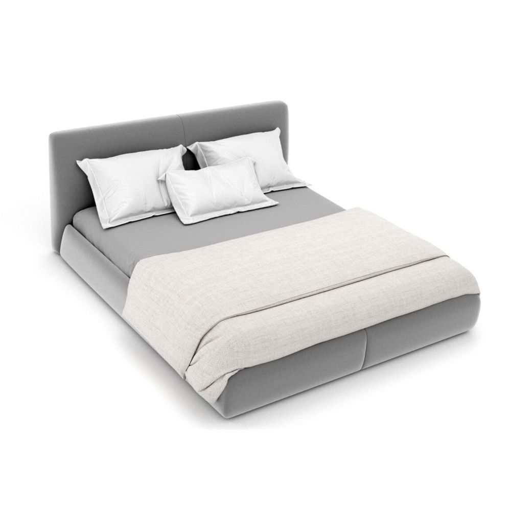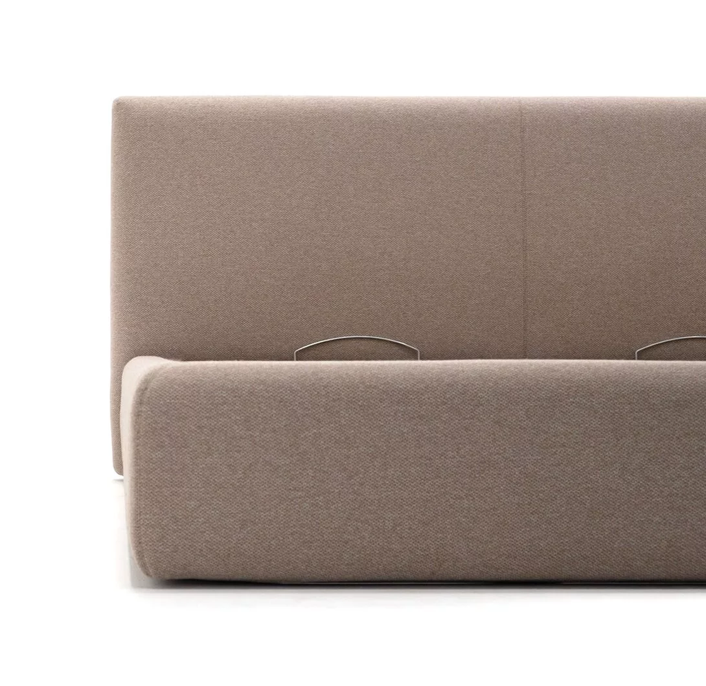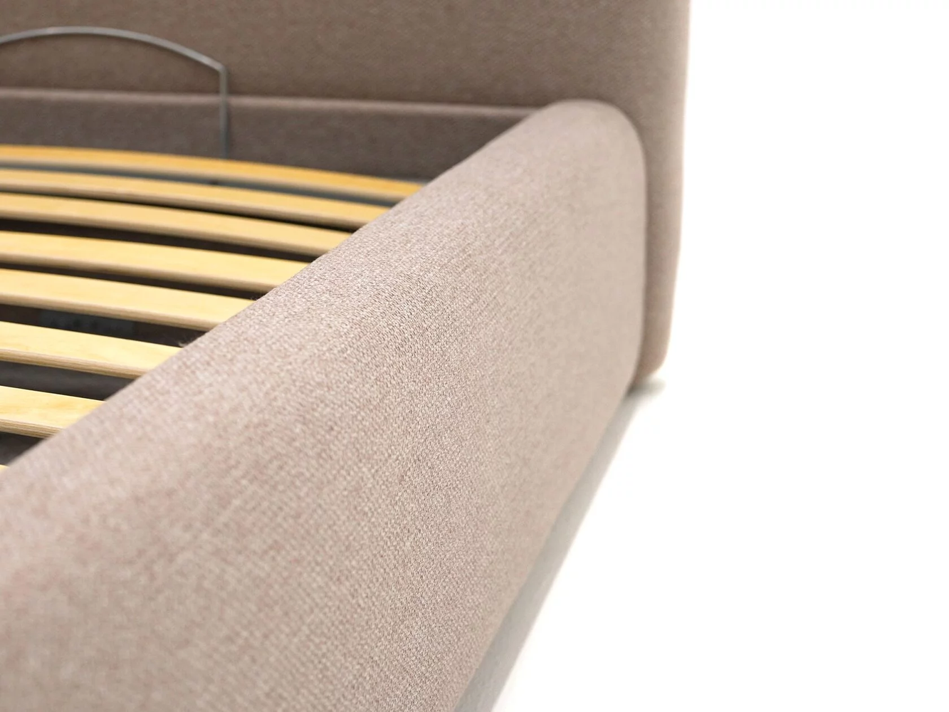 Изголовье не выступает за габаритыкороба кровати, при этом толщинаборта не превышает 85 мм. Короб кровати имеет декоративный шов по переднему борту и диагональное крепление с изголовьем кровати
